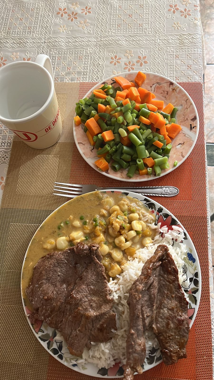 Pechuga, arroz, ensalada de granos (habas, choclo, tomate, etc.)