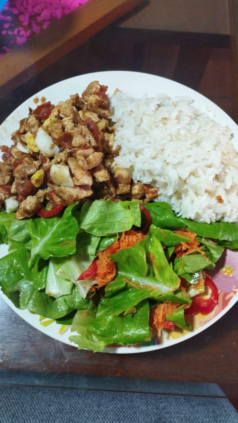 Pollo salteado con huevo, arroz, ensalada de hojas