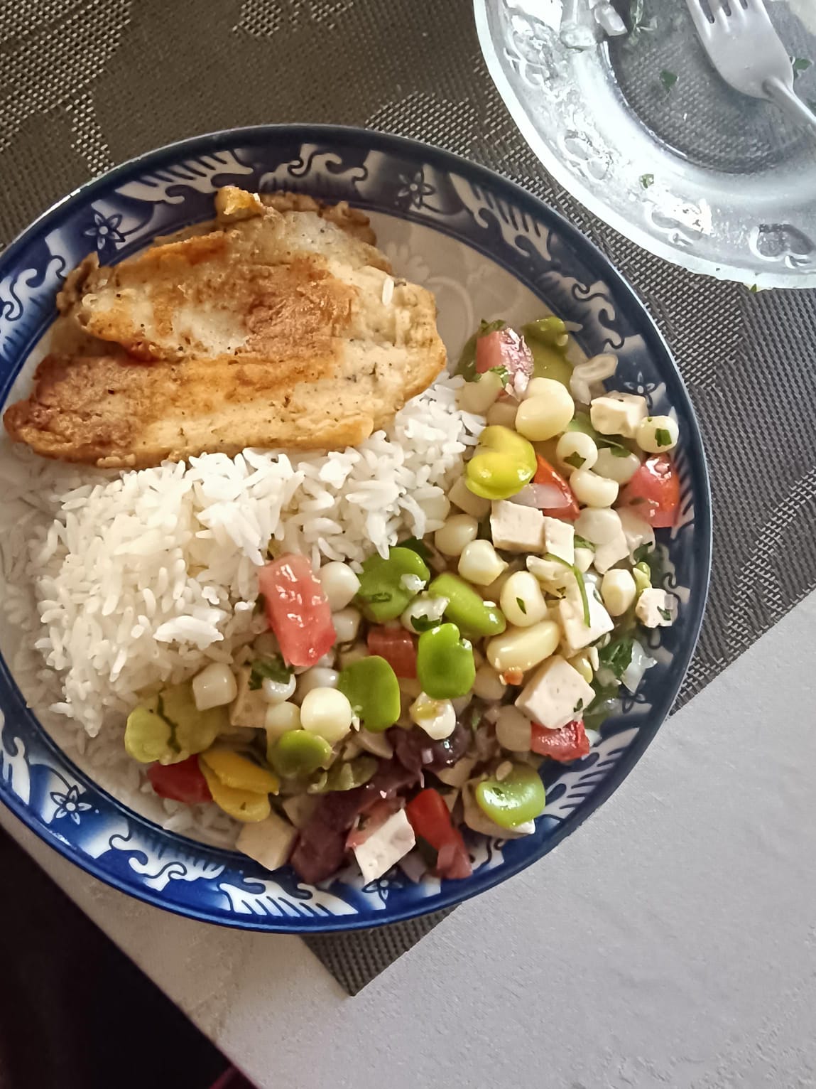 Pechuga, arroz, ensalada de granos (habas, choclo, tomate, etc.)